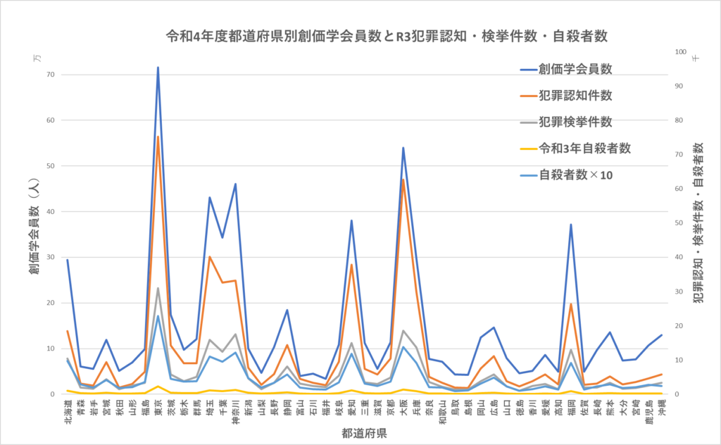 犯罪、自殺、精神疾患、若年無業者層と創価学会員数との強い関連は、創価学会という組織がその不透明な資金を使って学会員の中の無業者や創価学会系企業などの信者に集団ストーカーという工作活動に従事させ、組織(体制)にとって不都合な人間を排除するために暗躍していることを反映しているのではないか。