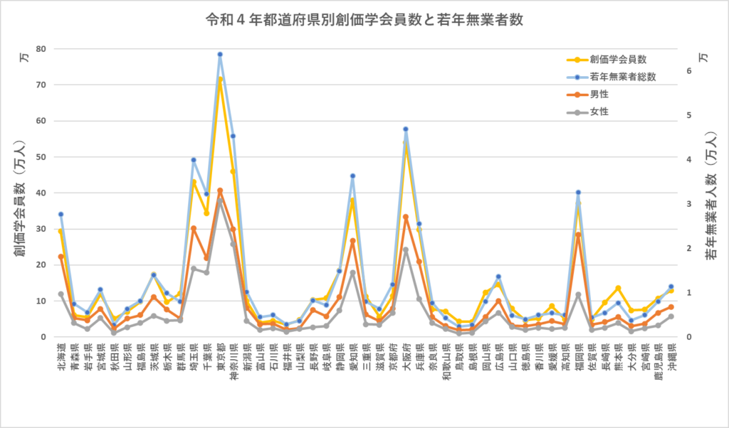 そこで、令和4年の都道府県別創価学会員数と若年無業者数を調べた。