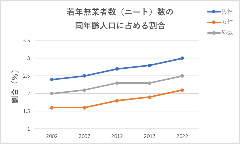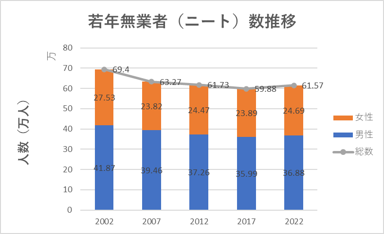 若年無業者層(いわゆるニート)という概念は、2000年代に入ってから唱えられたものである。時代背景には、10年ほど前にバブルが崩壊し就職氷河期に入ったことが上げられる。「何十社面接を受けても採用されない」という厳しい経験を余儀なくされ、自己肯定感を失いひきこもってしまった若者も多いのではないか。