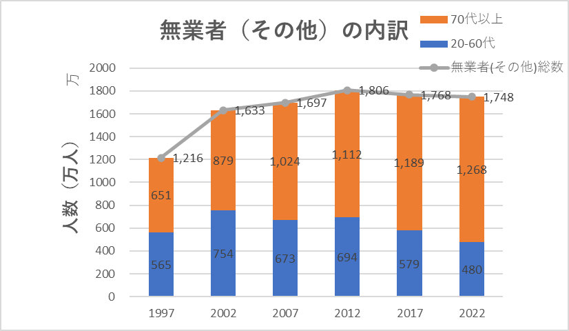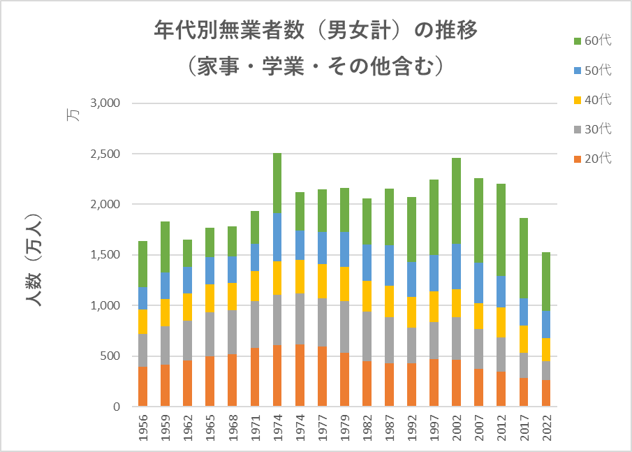 2002(令和4)年では、4300万人を超える無業者がいる。このうち、70代以上が約2330万人、学生が主である10代が約450万人である。これらの集団は基本的に無業者である。注目したいのは、残り約1550万人の20代から60代現役世代である。この世代の無業者層の年齢別内訳の推移を示す。